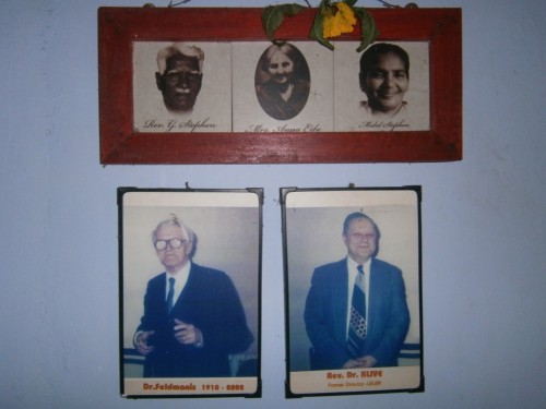 Baznīcā pie sienām kā pateicība piestiprinātas vairākas šīs misijas dibinātāju, kā arī aktīvāko un ilggadējo atbalstītāju foto. Augšējā rindā redzami tamilu luterāņu mācītājs G.Stīvens, LELB 1.misionāri Indijā Anna Irbe un mācītāja sieva M.Stīvena, kuri 1933.gadā kopā uzsāka Dieva svētīto kalpošanu Dienvidindijā. Apakšējā rindā redzami Roberts Feldmanis un Visvaldis Klīve.